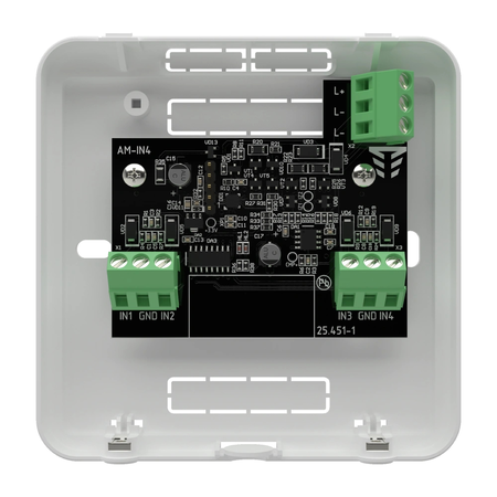 AM-IN4 - адресний модуль, призначений для збільшення кількості входів в системі Tiras PRIME A. Додає чотири універсальні входи для контролю стану протипожежної автоматики. 4 універсальні входи; Вбудований ізолятор короткого замикання; Світлодіодна індикація режимів роботи та стану пристрою; Живлення від адресного інтерфейсу.