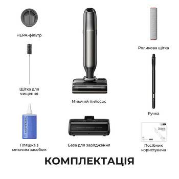 пылесос, ручка, база для зарядки, щетка для очистки, моющее средство, роликовая щетка мягкая, HEPA-фильтр