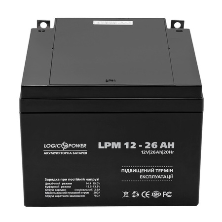 Представлений увазі відвідувачів нашого сайту кислотний акумулятор LPM 12 - 26 AH - це надійне в експлуатації пристрій, здатний забезпечити вашу техніку необхідним харчуванням. Модель свинцево кислотного АКБ відрізняється своїми високими якісними характеристиками за рахунок використання найбільш інноваційних технологій і якісних матеріалів, що застосовуються для його виробництва. Основні характеристики кислотного акумулятора LPM 12 - 26 AH: - Тип: свинцево кислотний АКБ (AGM технологія) - Номінальна напруга: 12V - Ємність АКБ: 26 Ah - Температура зберігання: -20 ° С - + 50 ° С - Робоча температура: +25 ° С +/- 5 ° С Герметичний корпус моделі відрізняється своєю стійкістю до механічного впливу і не потребує будь-якого додаткового догляду або обслуговування. LPM 12 - 26 AH - це оптимальне рішення для використання в UPS (ДБЖ), охоронних / пожежних системах, систем контролю і управління доступом і інших.