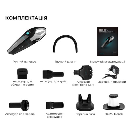 пилосос, аксесуар для рідини, аксесуар для мебели, запасний фільтр, зарядна база, аксесуар BestFriend Care, зарядний пристрій, аксесуар для куточків, аксесуар для шлангу
