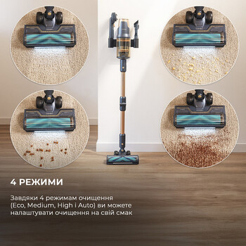 Завдяки 4 режимам прибирання (Автоматичний, Стандартний, Турбо та Еко) ви можете налаштувати прибирання на свій смак. Кожен режим дозволить вам адаптуватися до кожної ситуації, дозволяючи краще контролювати використання батареї та підвищувати ефективність збирання.