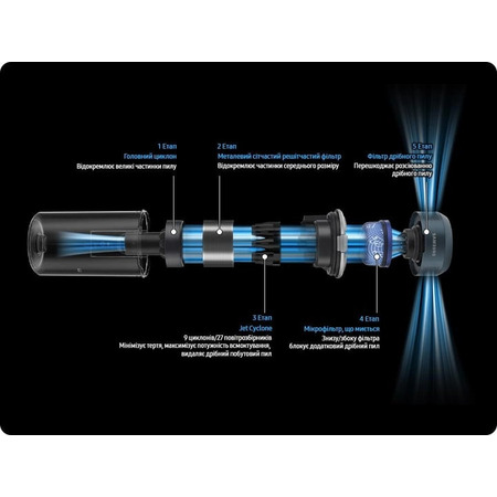 - Багатоциклонна система фільтрації затримує дрібні частинки пилу.