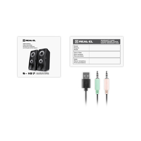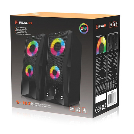 Мультимедійна акустична система REAL-EL S-107 – легке та доступне вирішення питання озвучування комп’ютера чи ноутбука. АС оснащена вбудованим підсилювачем, а також акустичним та сигнальним кабелями, що дозволяє підключати її практично до будь-яких джерел аудіосигналу. Живлення здійснюється через USB-порт ПК, ноутбука або блок живлення 5V DC за допомогою вбудованого кабелю USB.