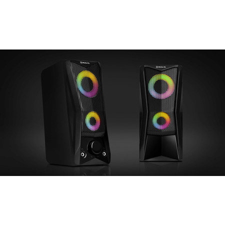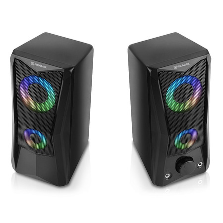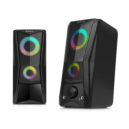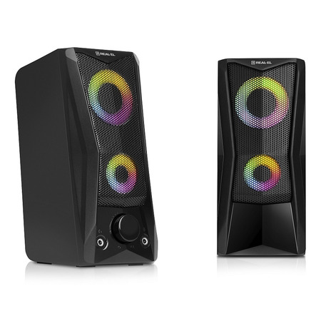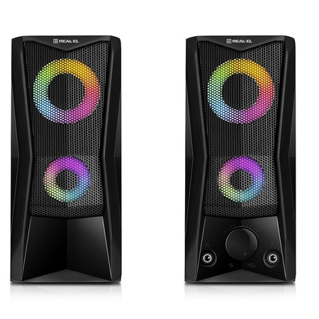 REAL-EL S-107 має зручний регулятор гучності та додаткові роз’єми для підключення навушників та мікрофона. Яскраве підсвічування надає динамічності та створює приємну атмосферу під час роботи на комп’ютері чи відпочинку з улюбленою музикою.