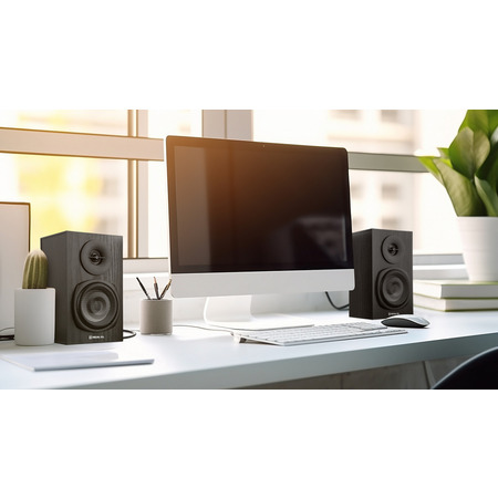 Компактний розмір ідеально підходить для будь-якого простору. Акустика виготовлена з високоякісних матеріалів, включаючи дерево (MDF), що позитивно відображається на звучанні.