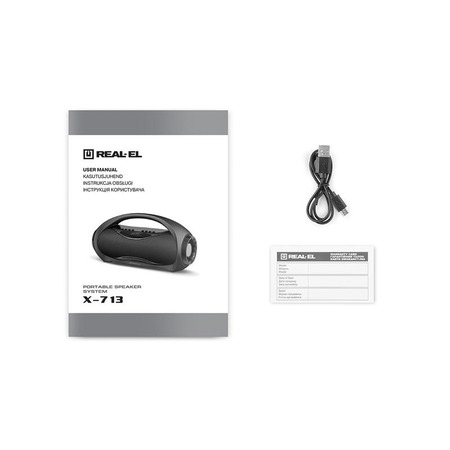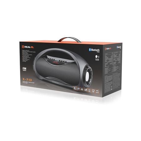 Мультимедійна портативна акустична система REAL-EL X-713 має сучасний дизайн з якісним звучанням. Широкий функціонал "бумбокса" дає змогу прослуховувати музику, підключаючи мобільний пристрій, ПК, TV, ноутбуки тощо, як через вивід AUX, так і через Bluetooth. USB і Micro SD card роз'єми дають можливість прослуховувати аудіо-файли з flash-носіїв.