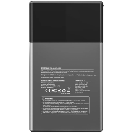 Автомобільний портативний Jump Starter X7 від Vtoman - це надійний помічник для автовласників у випадку розрядження акумулятора автомобіля або потреби у накачуванні шин чи зарядки електронних пристроїв. Будьте уважними та дотримуйтеся інструкцій виробника для безпеки та ефективності використання.