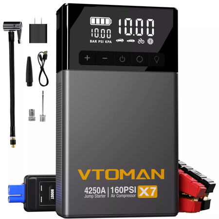 Автомобільний портативний Jump Starter X7 від Vtoman є потужним та універсальним пристроєм, який ідеально підходить для запуску двигуна автомобіля, зарядки електронних пристроїв та накачування шин та інших надувних виробів. Цей Jump Starter має потужність 4250A, що дозволяє запускати навіть найпотужніші двигуни автомобілів. Крім того, він оснащений вбудованим компресором з тиском 150PSI, який дозволяє швидко накачувати шини або надувати інші предмети. Завдяки ємності акумулятора 88,8Wh, ви зможете заряджати різноманітні пристрої у будь-який час.