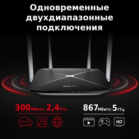 Завдяки підтримці дводіапазонного Wi-Fi до мережі можна підключити більше пристроїв. Швидкість до 300 Мбіт/с на 2,4 ГГц - це відмінний вибір для повсякденних завдань, як робота в інтернеті чи перевірка пошти, в той час як швидкість до 867 Мбіт/с на 5 ГГц впорається з усіма ресурсоємними завданнями, такими як онлайн-ігри і потоковий перегляд HD-відео. Мовленн обох каналів відбувається одночасно, дозволяючи виконувати всі ці завдання паралельно на різних пристроях.