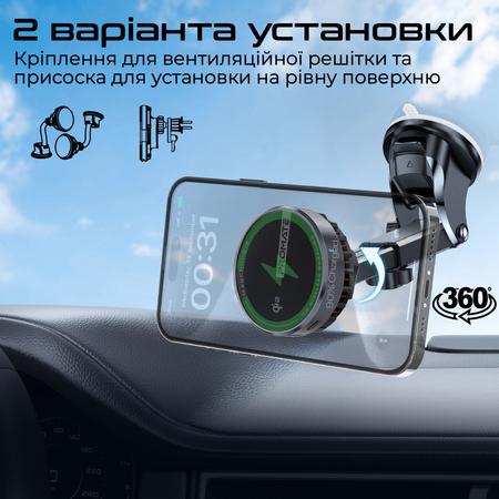 - 2 варіанти установки: Кріплення для вентиляційної решітки та вакуумна присоска для установки на торпедо чи вітрове скло