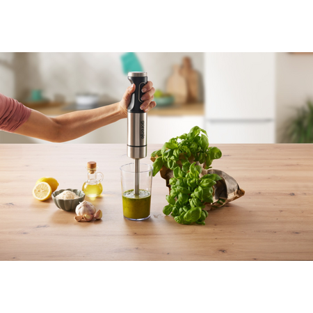 Блендер з нержавіючої сталі з потужним лезом, виконаний в елегантному дизайні, дозволить вписати цей ручний блендер в будь-яку кухню.
