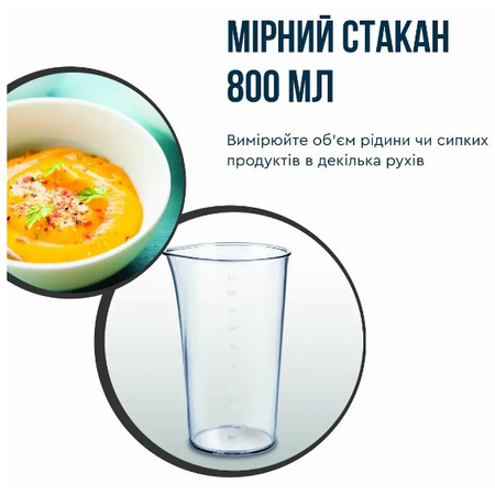 Вимірюйте об’єм рідини чи сипких продуктів в декілька рухів із допомогою зручного й точного мірного стакана на 800 мл. Зберігайте ідеальну рецептуру ваших кулінарних шедеврів.