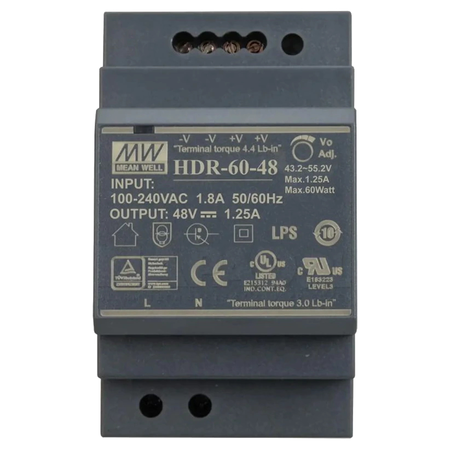 ● Кількість фаз 1;● Мінімальна вхідна напруга 85 В;● Максимальна вхідна напруга 264 В;● Вихідний струм, не більше 1.25 А;● Вихідна напруга 48 В;● Вихідна потужність 60 Вт;● Тип монтажу На DIN рейку
