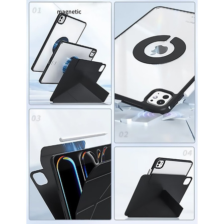 Унікальна конструкція підставки дозволяє складати обкладинку в різні положення для комфортного перегляду відео, читання або роботи. Вбудовані магніти надійно утримують обкладинку, забезпечуючи фіксацію у вибраному положенні.