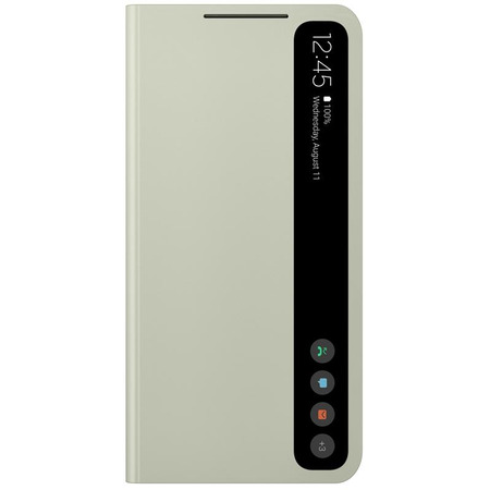 Чохол-книжка Clear View Cover виготовлений з ударостійкого полікарбонату, який відрізняється своєю міцністю та зносостійкістю. Він покритий невеликим шаром текстурованого поліуретану, що надає чохлу вишуканого вигляду. Додатково чохол покритий спеціальним антимікробним напиленням, яке добре перешкоджає розмноженню мікробів, а значить кейс довше залишається чистим. Головною особливістю чохла-книжки Clear View для Samsung Galaxy S21 FE є спеціальне віконце з тонкого прозорого пластику на лицьовій панелі. Завдяки йому є можливість переглядати основну інформацію та взаємодіяти з екраном смартфона без необхідності відкриття верхньої кришки, наприклад, ставити музику на паузу, відповідати на дзвінки та відключати будильники.