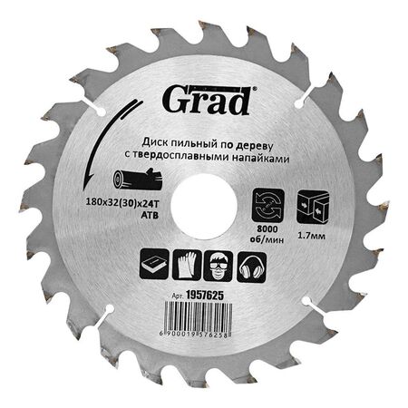 Диск пиляльний по дереву з твердосплавними напайками Ø180×32 (30)×24Т, 8000об/хв GRAD (1957625) призначений для виконання будь-яких стандартних робіт по дереву, різання виробів з м'якої і твердої деревини, фанери, ДСП, ДВП, МДФ і комбінованих матеріалів на основі дерева. Додатковою перевагою є можливість заміни і заточування зуба.