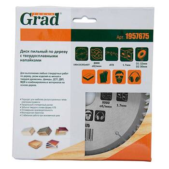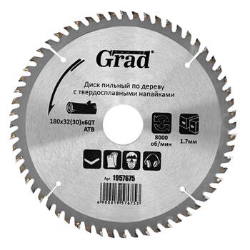 Диск пиляльний по дереву з твердосплавними напайками Ø180×32 (30)×60Т, 8000об/хв GRAD (1957675) призначений для виконання будь-яких стандартних робіт по дереву, різання виробів з м'якої і твердої деревини, фанери, ДСП, ДВП, МДФ і комбінованих матеріалів на основі дерева. Додатковою перевагою є можливість заміни і заточування зуба.
