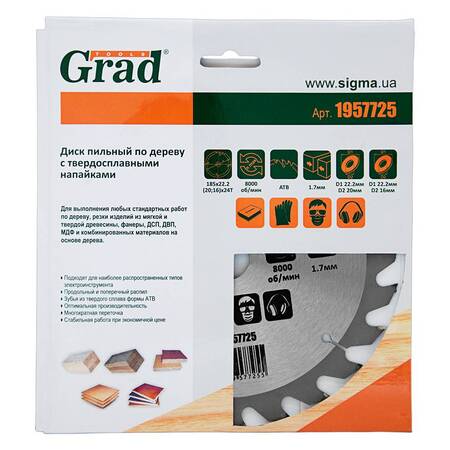Диск пиляльний по дереву з твердосплавними напайками Ø185×22.2 (20; 16)×24Т, 8000об/хв GRAD (1957725) призначений для виконання будь-яких стандартних робіт по дереву, різання виробів з м'якої і твердої деревини, фанери, ДСП, ДВП, МДФ і комбінованих матеріалів на основі дерева. Додатковою перевагою є можливість заміни і заточування зуба.