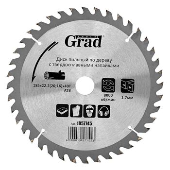 Диск пиляльний по дереву з твердосплавними напайками Ø185×22.2 (20; 16)×40Т, 8000об/хв GRAD (1957745) призначений для виконання будь-яких стандартних робіт по дереву, різання виробів з м'якої і твердої деревини, фанери, ДСП, ДВП, МДФ і комбінованих матеріалів на основі дерева. Додатковою перевагою є можливість заміни і заточування зуба.