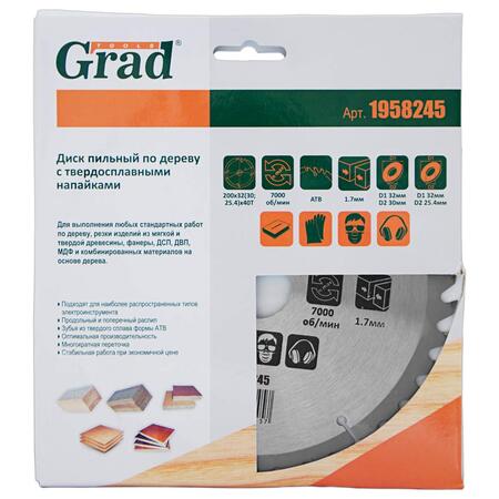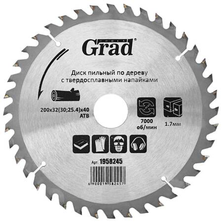 Диск пиляльний по дереву з твердосплавними напайками Ø200×32 (30; 25.4)×40Т, 7000об/хв GRAD (1958245) призначений для виконання будь-яких стандартних робіт по дереву, різання виробів з м'якої і твердої деревини, фанери, ДСП, ДВП, МДФ і комбінованих матеріалів на основі дерева. Додатковою перевагою є можливість заміни і заточування зуба.