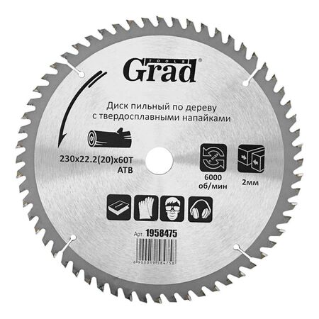 Диск пиляльний по дереву з твердосплавними напайками Ø230×22.2 (20)×60Т, 6000об/хв GRAD (1958475) призначений для виконання будь-яких стандартних робіт по дереву, різання виробів з м'якої і твердої деревини, фанери, ДСП, ДВП, МДФ і комбінованих матеріалів на основі дерева. Додатковою перевагою є можливість заміни і заточування зуба.