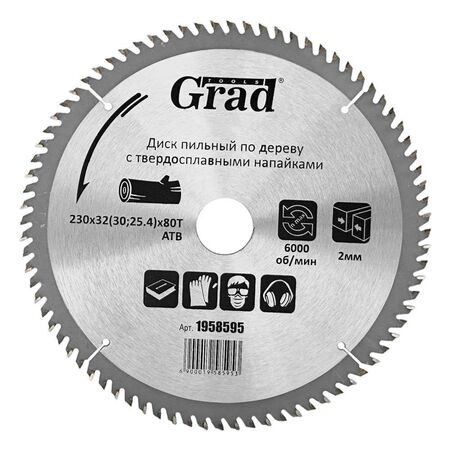Диск пиляльний по дереву з твердосплавними напайками Ø230×32 (30; 25.4)×80Т, 6000об/хв GRAD (1958595) призначений для виконання будь-яких стандартних робіт по дереву, різання виробів з м'якої і твердої деревини, фанери, ДСП, ДВП, МДФ і комбінованих матеріалів на основі дерева.