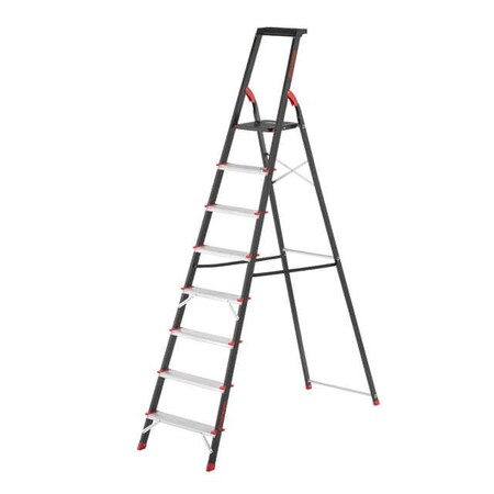 Драбина визготовлена з міцного сталевого профілю з алюмінієвими сходинками. Рифлені сходинки не дадуть зісковзнути нозі і гарантують безпечний підйом, а також зручне положення під час роботи. Драбина відповідає європейському стандарту EN131 і витримує навантаження до 150 кг.
