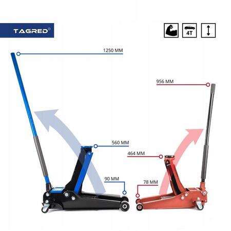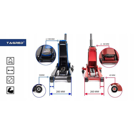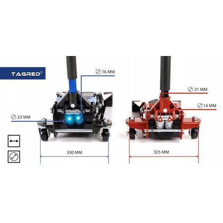 TAGRED TA288 має низький профіль, який дозволяє без зусиль підняти навіть найнижчі автомобілі. Вбудована сигналізація вказує на перевищення максимальної ваги, що забезпечує безпеку під час роботи з домкратом.