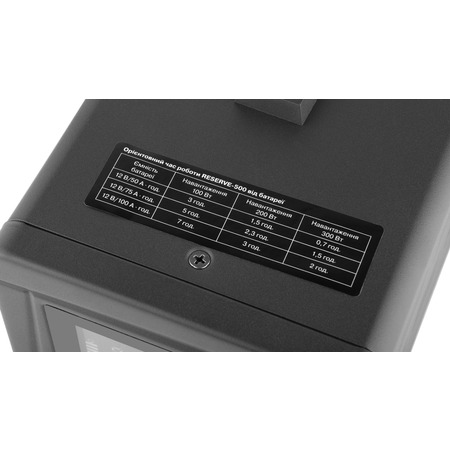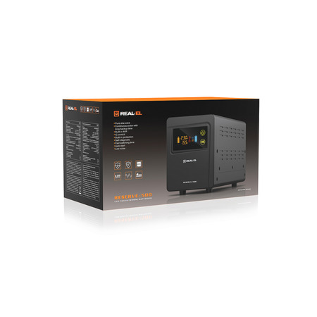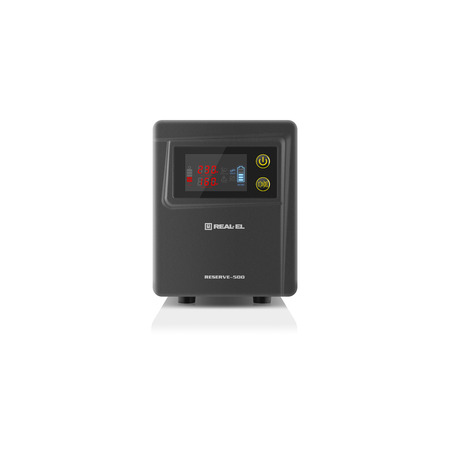 Лінійно-інтерактивне ДБЖ безперервної дії з тривалим часом резервування для підключення зовнішніх батарей REAL-EL RESERVE-500 призначено для експлуатації зі свинцево-кислотними необслуговуваними акумуляторними батареями типу AGM з напругою 12 В. Принцип його дії засновано на перетворенні постійного струму зовнішніх батарей у змінний. Форма струму на виході – правильна синусоїда. ОСОБЛИВОСТІ Правильна синусоїда вихідної напруги Безперервна дія з тривалим часом резервування Вмонтований стабілізатор напруги мережі Мікропроцесорне управління Захист від КЗ в підключеному до ДБЖ навантаженні, а також від перевантаження Захист від підвищеної або зниженої напруги мережі Ступінь захисту від зовнішнього впливу IP-20 Самодіагностика при вмиканні Індикація режимів роботи на LCD-дисплеї Час перемикання режимів – менше 4 мсек Функція «автостарт» Низький рівень шуму