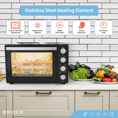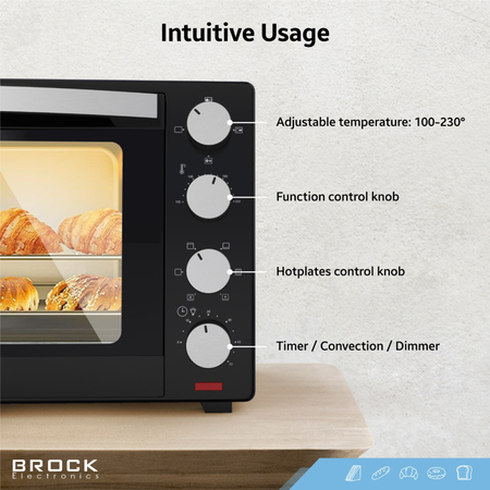 Нагрівальний елемент з нержавіючої сталі, Ручка з нержавіючої сталі, Таймер, Звуковий сигнал, Подвійне скло дверцят, Функція конвекції, Внутрішнє освітлення