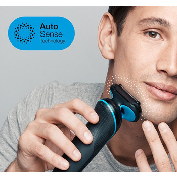 У цій моделі застосовано запатентовану сіткову систему гоління з рухомими ріжучими елементами (3 Flexible Blades, технологія MicroComb). Вони плавно слідують за вигинами підборіддя, постійно залишаючись на рівній відстані від шкіри, що дає змогу з першого ж проходу отримати рівномірну якість гоління. Додатково ефективність гоління підвищується завдяки технології Auto Sensing Technology - бритва враховує щільність щетини, автоматично підвищуючи потужність, якщо це необхідно на певній ділянці. Змінний ріжучий блок з 2-ма сіточками Senso Foil + тример MiddleTrimmer легко монтується і так само легко знімається одним рухом через систему підключення Easy Click. Бритва поставляється із захисною кришкою та щіточкою для очищення.