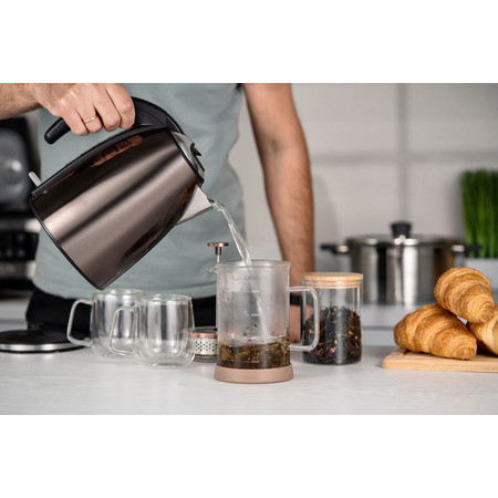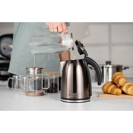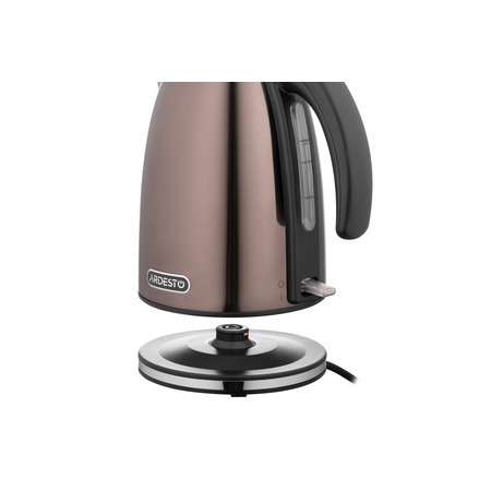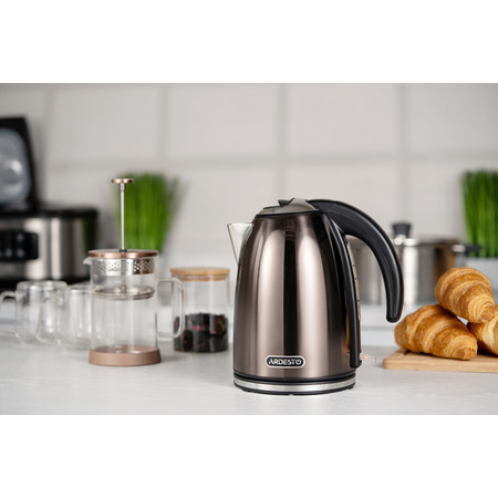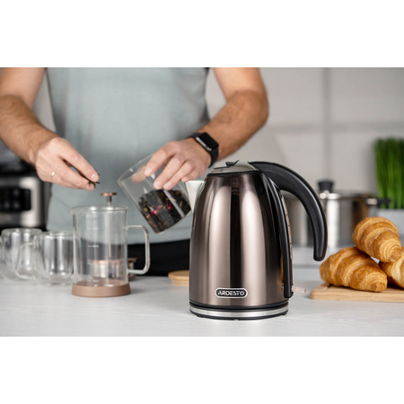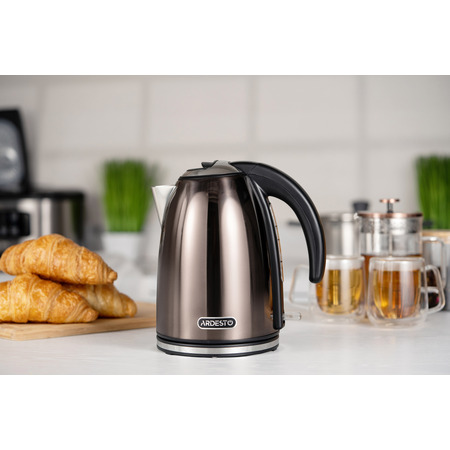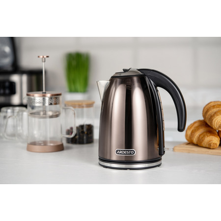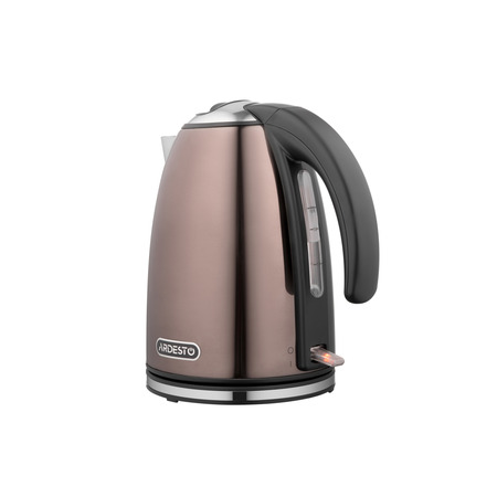 Електрочайник Ardesto EKL-F340BRZ - це стильний і функціональний кухонний прилад, який призначений для швидкого нагрівання води для чаю, кави або інших гарячих напоїв. Цей електрочайник має привабливий дизайн зі зблискуючим металічним корпусом у бронзовому кольорі, що надає йому елегантний і сучасний вигляд.