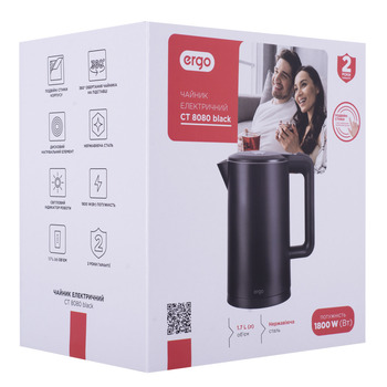ERGO СT 8070 Black має оптимальний об’єм 1.7 літри та важить 1.47 кг. За допомогою нагрівального елемента у вигляді закритого диску, вода в чайнику закипає за лічені хвилини. Ергономічна конструкція приладу дозволяє легко очищувати його від накипу та забруднень.