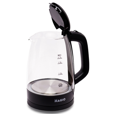 Чайник MG-505 об’ємом 1,7 л поєднує в собі стильний дизайн із неперевершеною якістю й довговічністю. Корпус виконаний із прозорого термостійкого скла, завдяки чому в воді неможлива поява неприємного присмаку чи навіть шкідливих для здоров’я речовин.