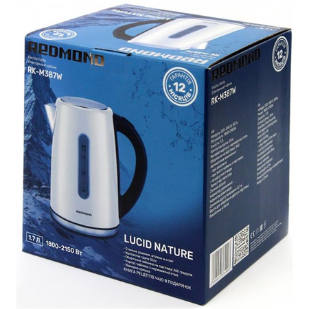 Стильний електрочайник Redmond RK-M387W має об’єм 1,7 літра та потужність 2150 Вт. Оснащений світловим індикатором, вбудованою системою автоматичного відключення за відсутності води. Чайник має захист від перегріву, фільтр, що знімається, індикатор рівня води.
