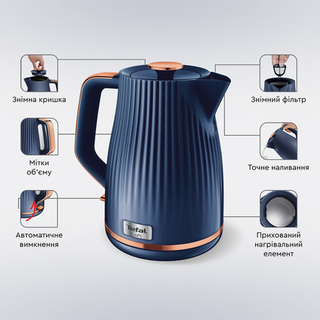 Електричний чайник TEFAL KO251430 вирізняють висока потужність, великий об’єм і неординарний дизайн. Ця модель стилізована під класичний британський посуд. У конструкції передбачено всі необхідні елементи та функції, включно із сітчастим фільтром від накипу та автовідключенням у разі закипання і знімання з підставки. Електрочайник TEFAL KO251430 оснащений знімною кришкою. Таке рішення вибрано не тільки через особливості ретро-стилю, а й для того, щоб спростити процес догляду за приладом. Комфортне використання забезпечують зручна ручка і витончений носик, що точно направляє потік води. Пластиковий фільтр дає змогу утримувати осад, який утворюється в разі кип’ятіння жорсткої води. Для її дозування передбачена шкала, нанесена на прозору вставку в корпусі (min об’єм - 0,7 л, max - 1,7 л). Під час увімкнення чайника спрацьовує підсвічування, вимкнення здійснюється в автоматичному режимі.
