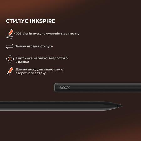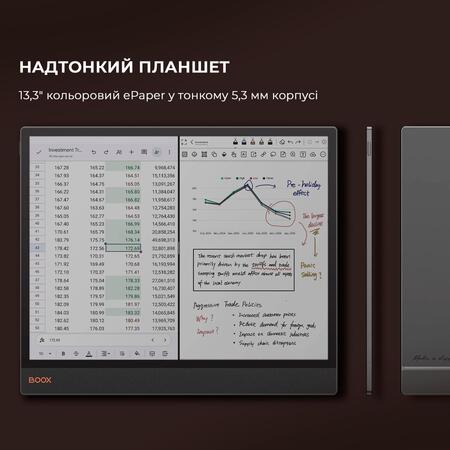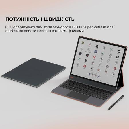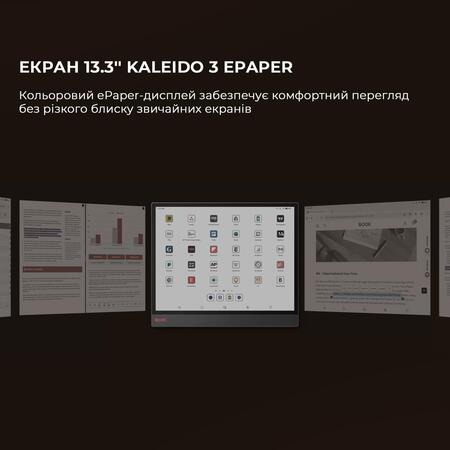 BOOX Tab XC – це 13,3-дюймовий кольоровий електронний рідер, заснований на високопродуктивній апаратній платформі та з широкими можливостями роботи з документами. Модель має сенсорний екран E Ink Kaleido 3 з фронтальним підсвічуванням та регулюванням колірної температури, а також подвійним сенсорним керуванням. Ємнісний датчик дозволяє зручно керувати пристроєм, а індуктивний датчик дає можливість робити малюнки та рукописні нотатки. Модель базується на потужному 8-ядерному процесорі та 6 ГБ оперативної пам’яті. Новий графічний процесор з технологією BOOX Super Refresh забезпечує швидке оновлення екрана та плавний рух об’єктів на екрані. Tab XC ідеально підходить не тільки для читання, але й для роботи з різними типами документів, включаючи кольорові зображення. Операційна система Android 13 дозволяє встановлювати та використовувати сторонні програми. Вбудований модуль Wi-Fi надає можливість завантажувати файли з Інтернету та користуватися різними мережевими сервісами, а підтримка Bluetooth дозволяє підключати зовнішні пристрої. 128 ГБ вбудованої пам’яті дає змогу зберігати в пристрої будь-які необхідні електронні книги та документи без будь-яких обмежень. Пристрій виготовлений у легкому та міцному корпусі. Корпус зі сплаву алюмінію та магнію, екран додатково покритий захисним склом. Модель підтримує активний стилус для рукописних нотаток та малюнків. Акумулятор високої ємності 5500 мАг забезпечує тривалий час автономної роботи. Для Tab XC доступні 2 типи чохлів – магнітний чохол та спеціальний чохол із клавіатурою та трекпадом, що підходить для зручного набору тексту. Ці чохли можна придбати окремо. Їх можна використовувати для захисту BOOX Tab XC під час транспортування.