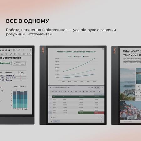 Насолоджуйтесь реалістичними кольорами та чіткими деталями на широкому дисплеї, створеному для кожного читача. Завдяки вбудованому NeoReader ви можете виділяти, додавати нотатки та налаштовувати теми відповідно до вашого настрою чи завдання. Завдяки підтримці різних форматів? доступ до ваших матеріалів для читання є простим та зручним.