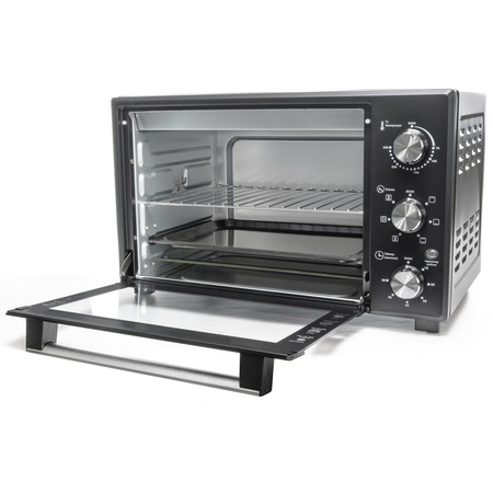 На лицьовій панелі електропечі розташований механічний регулятор температури. Термостат дозволяє встановлювати температуру від 70°С до 250°С. Така можливість настройки теплового режиму дозволяє готувати страви, як при сильному нагріванні (при 250°С), так і при легкому термічному впливі. Блюда не пригорають навіть при високій температурі, бо гаряче повітря всередині печі розподіляється рівномірно.