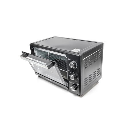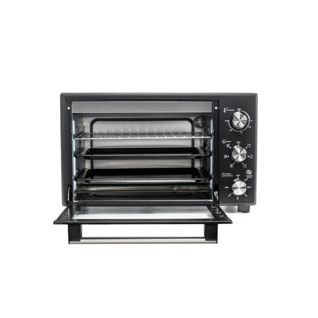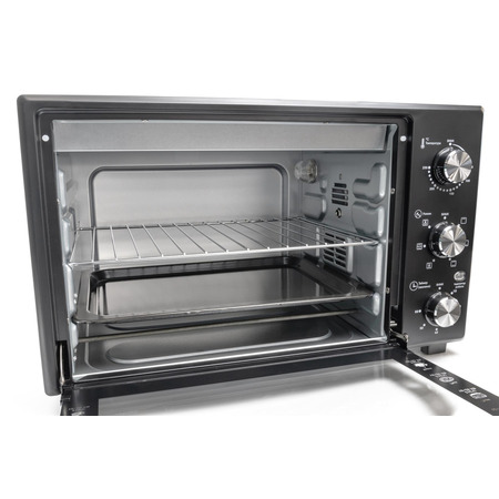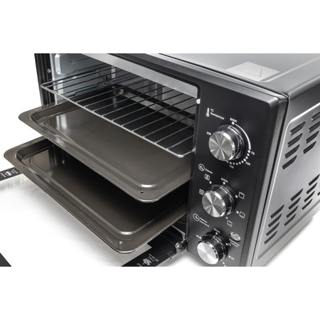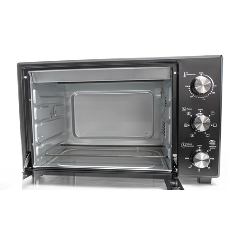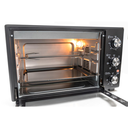 На лицьовій панелі електропечі розташований механічний регулятор температури. Термостат дозволяє встановлювати температуру від 70°С до 250°С. Така можливість настройки теплового режиму дозволяє готувати страви, як при сильному нагріванні (при 250°С), так і при легкому термічному впливі. Блюда не пригорають навіть при високій температурі, бо гаряче повітря всередині печі розподіляється рівномірно.