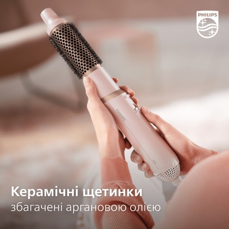 Цей фен-щітка оснащений керамічними щітками з аргановою олією, що робить укладання швидшим і простішим, забезпечуючи комфортне ковзання для шовковистого волосся.