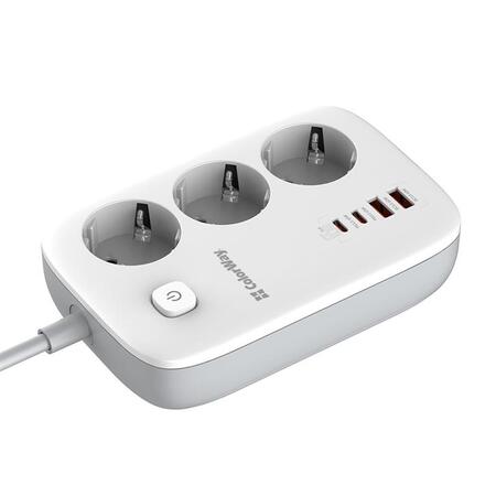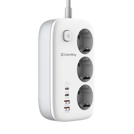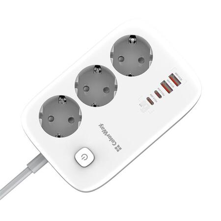 Компактний подовжувач з трьома розетками 220В і з 2 портами USB, що підтримують технологію швидкої зарядки Quick Charge 3.0/4.0, і 2 USB-C PD з підтримкою протоколів PD (Power Delivery) 2.0/3.0, 65W PPS; APPLE FAST CHARGE; SAMSUNG 5V-2A/AFC/SFC; QC2.0/3.0/4.0+; HUAWEI FCP/SCP, VOOC, XIAOMI 27W TURBO CHARGING. Пристрій має продуману конструкцію, що дозволяє одночасно підключати не тільки електроприлади, а й одночасно заряджати до чотирьох мобільних пристроїв без будь-яких труднощів. При цьому технологія інтелектуального контролю визначає та забезпечує оптимальну напругу для кожного девайсу, тоді як спеціальний чіп захищає від навантаження, короткого замикання чи перегріву. Зарядний пристрій відноситься до нового покоління, в якому замість кремнієвих транзисторів використовують нітрид галію. Завдяки цьому зарядка практично не нагрівається, споживає менше енергії і заряджає гаджети швидше за звичайні адаптери живлення. Максимальної потужності 65 Вт вистачить, щоб виробляти підзарядку не лише невеликих гаджетів, а й таких енергоємних пристроїв, як ноутбуки. Подовжувач оснащений захисними шторками за технологією Child Security Door, а також із зручною кнопкою включення та вимикання та LED індикацією. Контактні групи розеток виготовлені з високоякісного мідного сплаву. Корпус виконаний із жароміцного пластику, здатного витримати температуру до 750°C.