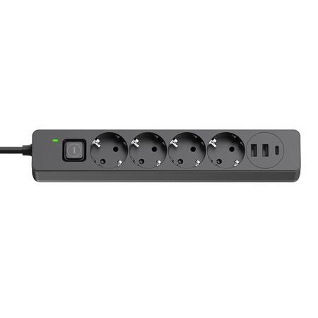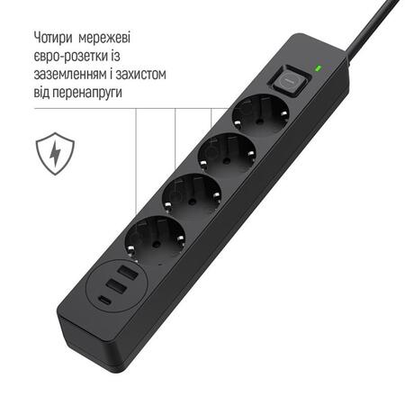 Подовжувач містить чотири мережеві розетки 220В і три USB-порти. Захисні шторки на розетках забезпечують безпеку використання, а автоматичне розподілення енергії між USB-портами забезпечує ефективне заряджання пристроїв (до 24Вт). Два USB-порти підтримують швидку зарядку Quick Charge 3.0, а третій порт USB-C PD підтримує швидке заряджання для Apple пристроїв. Зручна кнопка включення/виключення та світлодіодна індикація спрощують його використання. Цей подовжувач не лише дозволяє підключати електроприлади, а й одночасно заряджати до трьох мобільних пристроїв через USB-порти, таких як смартфони, планшети, зовнішні батареї тощо. Контактні групи розеток виготовлені з високоякісного мідного сплаву, а корпус стійкий до температур до 750°C. Подовжувач також обладнаний заземленням та захистом від перенапруги, що забезпечує безпечну роботу.