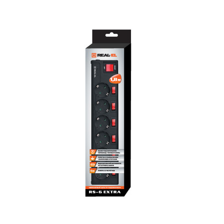 Мережевий фільтр живлення REAL-EL RS-6 EXTRA 3m, black (EL122300002) призначений для підключення до електричної мережі електроприладів і забезпечення їх захисту від високовольтних імпульсів напруги і постійної фільтрації високочастотних перешкод.