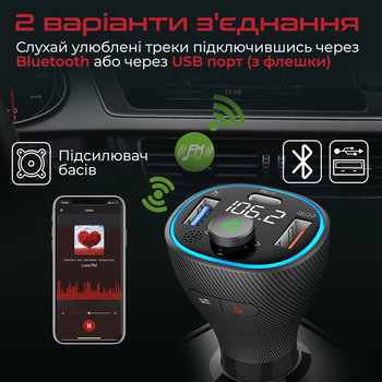2 варіанти з’єднання: Слухай улюблені треки підключившись через Bluetooth або через USB порт (з флешки).
