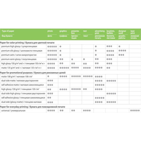 Глянцевий фотопапір PrintPro для повсякденного струменевого і лазерного друку. Має гладку, глянцеву поверхню. Завдяки паперовій основі і помірним ступенем глянцю, папір підходить для друку фотографій і графіки, як на струменевих, так і лазерних принтерах. Має гарні властивості по вбиранню чорнил та закріпленню тонера. При друку пігментним чорнилом рекомендовано просушувати відбиток щоб запобігти змазуванню з поверхні. Зберігати в сухому місці в стороні від сонячного світла. Температура зберігання від 5°С до 25°С. Не містить шкідливих для здоров"я речовин. Надруковані знімки рекомендовано зберігати в альбомах або в рамках під склом. Ця модель паперу призначена тільки для друку на струменевому принтері та персонального використання.