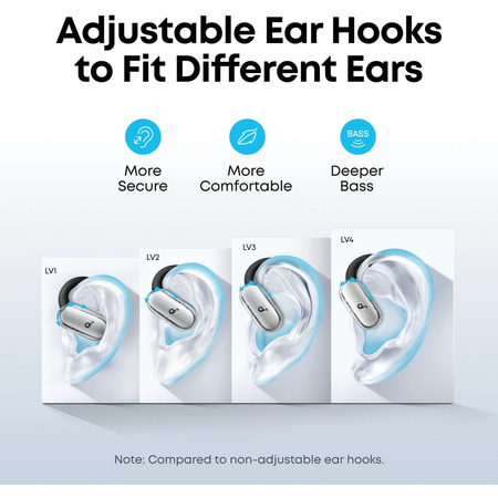 Гарнітура вирізняється інноваційним відкритим дизайном, який не закриває вушний канал, забезпечуючи комфорт без тиску та дозволяючи чути навколишні звуки. Завдяки 4-рівневим регульованим вушним гачкам, SoundCore V40i адаптується до будь-якої форми вуха, забезпечуючи надійну фіксацію навіть під час інтенсивних рухів. Ця конструкція не лише підвищує комфорт, але й наближає динаміки до вушного каналу, забезпечуючи глибший бас із приростом до 7.5 дБ порівняно з нерегульованими гачками, що робить звук насиченим і потужним.