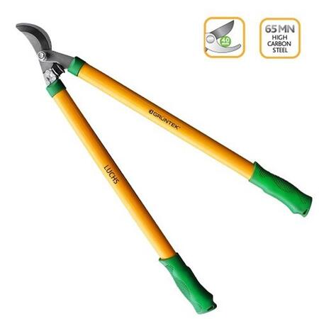 Gruntek Luchs 685 мм - гілкоріз для обрізання гілок з кущів і дерев товщиною до 40 мм. Леза виготовлені з SK5 сталі, яка гостро заточена для обробки твердих сухих гілок. Верхнє лезо зі спеціальним покриттям від налипання, яке запобігає залипання гілок, прилипання соку від гілок, а також пилу і бруду з дерева. Це покриття спрощує процес роботи і очищення інструменту після роботи. Рукоятки виготовлені зі сталі, які легко витримують сильне натискання при роботі. Рукоятки овальної форми зручно лягають в руці, а завдяки ергономічному покриттю не ковзають і ними можна комфортно працювати довгий час. Довжина інструмента 685 мм дає можливість обрізати нижні гілки дерев, не використовуючи додаткових пристосувань. Гілкоріз Gruntek Luchs допоможе Вам впоратися зі старими або просто заважаючими гілками в Вашому саду.