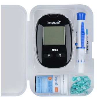 Глюкометр, тест смужки №10, ланцетний пристрій, ланцети №10, контрольний розчин 3шт. (для контролю работи глюкометра та придатності тест смужок, пластиковий футляр, блокнот, інструкція, гарантийній талон