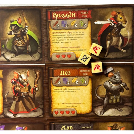 Кидай куби, бий ворогів, повторюй, поки не закінчиться бажання або планшетки локацій? Та ні ж! Це – справжня казка! Як вступ, так і післяслово до місій - це не один абзац сухого опису кімнати, це ціла історія. Це взаємовідносини між персонажами, це переживання, це розкриття характерів! Кожне мишенятко - це не просто фігурка на столі, це Герой зі своїм характером, своїми емоціями, своїми бажаннями! Для більшого занурення у всі ці пригоди кожен примірник гри містить книгу, яка допоможе цілковито й повністю поринути у вихор подій!